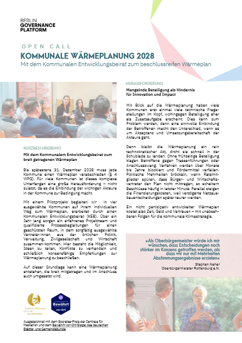 Wir nutzen deshalb den bewährten Beteiligungsansatz der Kommunalen Entwicklungsbeiräte auch im Bereich der Wärmeplanung. Dieses von Prof. Dr. Gesine Schwan und dem Team der Berlin Governance Platform entwickelte, preisgekrönte Format bringt Kommunalpolitik und Verwaltung gemeinsam mit Akteur*innen aus lokaler Wirtschaft und Zivilgesellschaft an einen Tisch. In einem moderierten Prozess über mehrere Sitzungen wird diskutiert, Interessen ausgehandelt, und am Ende ein Konsenspapier mit konkreten Empfehlungen verabschiedet.